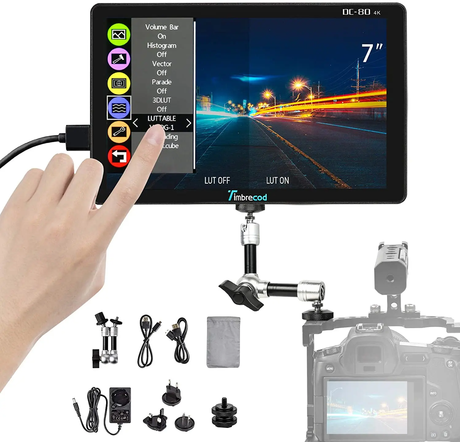 Best Timbrecod DC-80 7“ Touch Screen Camera Video Monitor 1920x1200 IPS 4K Pass-Through 4K HDMI Camera Field Monitor with Tilt Arm